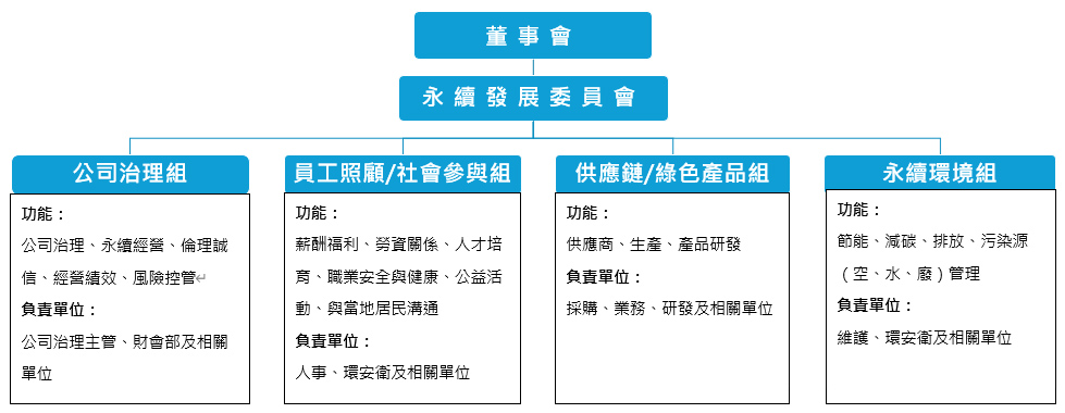 为落实环境保护、社会责任及公司治理等永续发展目标,本公司已于2024年11月成立永续发展委员会,由董事长担任召集人及会议主席。董事会则担任执行监督角色,授权永续发展委员会策略拟定、绩效监督等永续发展相关事宜。