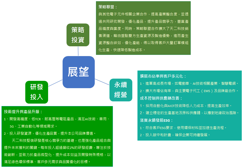 过去一年,地缘政治紧张局势依然持续影响市场需求,被动元件市场因来自中国大陆新製造商大量加入供应链,造成供需相对不对称。本公司在2024年度对于整体库存去化的努力下,连带产能利用率提升使生产单位成本下降,致整体销售业绩及获利有所提升。随着AI技术、车用、5G等市场持续成长,有望带动被动元件需求,未来公司仍将持续维持深耕海内外市场,并透过整合南通生产地的优势,推广天二科技品牌产品及优化各项产品品质,期盼2025年度的业绩和获利能力能更加稳定成长。